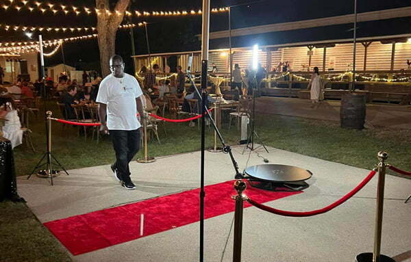 The Picture Perfect Red Carpet Experience includes a carpeted approach to our 360 platform. A choice of stanchion finish colors (silver or gold). Plus our classic decorated sign and prop table.
